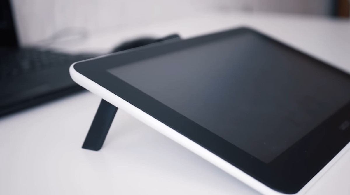 Я бы не сказала, что Wacom One – красивое устройство, но с другой стороны, а так ли важна внешняя красота? Мне кажется, нет. Куда важнее эргономика и удобство использования. Да и сборка здесь классная. Основание устройства выполнено из прочного белого пластика и имеет две встроенные складные ножки для регулировки высоты. В верхней части устройства находится порт для зарядки, тканевый держатель для стилуса и кнопку питания.