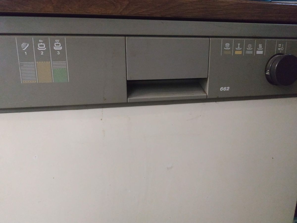 Начну с того, что эта модель посудомоечной машины досталась мне практически даром. Я за неё отдала по акции около 60$ в далёком прошлом. Прослужила она порядка 30 лет – сначала в ресторане, когда я открывала своё дело, а потом и на родной кухне. Я не имела возможности встроить её в комплектацию всей кухни, так как машина относится к категории частично встраиваемых. На передней панели дверцы нет специальных каркасных крепежей, чтобы установить дверцу. Я её поставила в специальный уголок для крупной техники для дома, сверху положила деревянную поверхность и разместила на ней другую утварь.