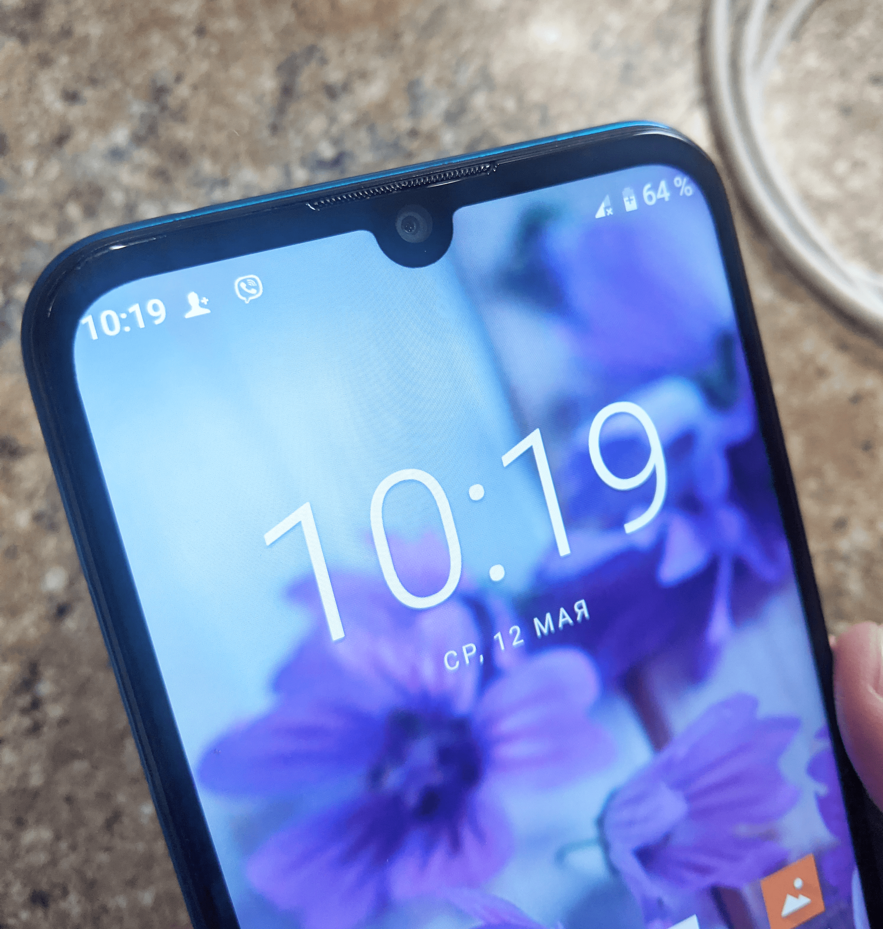 Спереди широкоформатный дисплей с толстыми рамками, особенно подбородком снизу. Сверху каплевидный вырез под фронтальную камеру и решетка разговорного динамика.