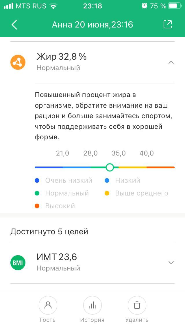 Хочу рассказать несколько примеров, и показать наглядно, какую информацию показывает приложение после интеграции с весами. Рассмотрю два примера – женщина 32 года и мужчина 29 лет.