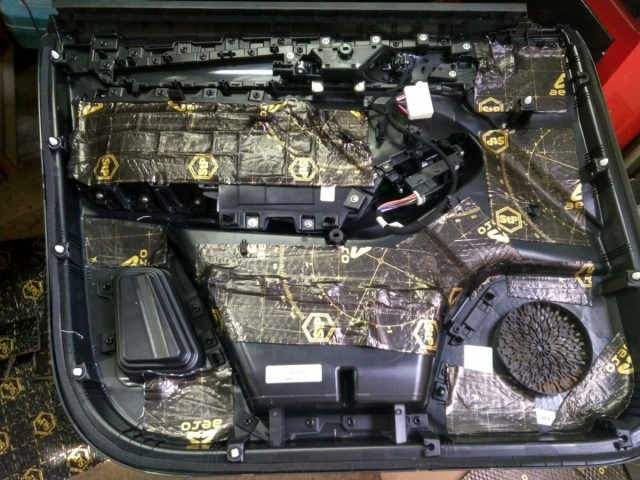 Не хочу делать рекламу, но так получается именно так. Спустя годы экспериментов я пришел к выводу, что самым лучшим виброизолирующим материалом по соотношению цены и качества является бренд STP. А вот шумопоглотитель типа «пирамидка» я предпочитаю «Шумофф». Но в этот раз я не стал клеить двери обычным толстым STP и усердствовать. Все дело в том, что петли дверей кроссовера Haval Jolion мне показались хлипкими и лишнюю нагрузку я не решился давать. Поэтому выбрал серию шумоизоляционного материала Aero. Эти листы вибропоглотителя облегчены и идеально подходят для дверей. Кстати, напомню, что смысла в толщине и количестве оклейки нет. Смысл закрыть большую часть поверхности, где-то 70-80%. Этого достаточно, чтобы получить эффект. Так я и поступил с дверьми Haval Jolion внутри, ну и заклеил полость цельным листом поверху. В том числе этот материал я наклеил на пластиковые карты дверей, чтобы пластик поменьше «играл» и звенел от басов. Целесообразность в этом есть, я проверял не раз.