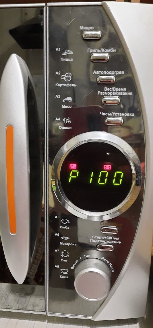 - Нажать «Микро» до появления индикации «Р 100» (100% мощность микроволн).