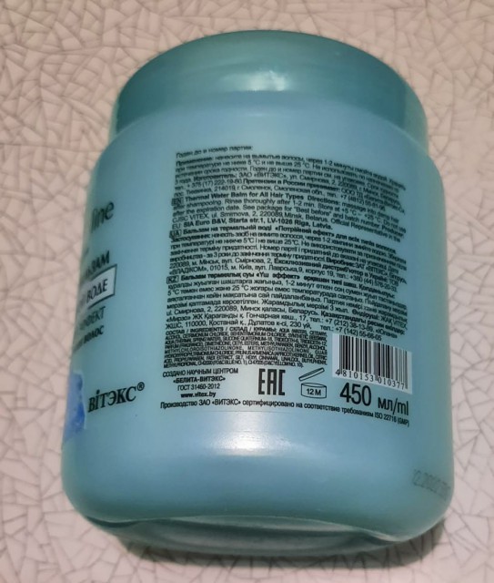 Выполнен в широкой пластмассовой банке цвета морской волны и объемом на 450 миллилитров. Имеет прочную завинчивающуюся крышку. Однотонность банки с этикетками на ней с двух боков позволяет свободно ознакомиться с составом средства и способом применения. Вязкость бальзама хорошая, продукт густой и насыщенный. Имеет голубой оттенок. Пахнет приятно, но парфюмерные отдушки слышны отчетливо.