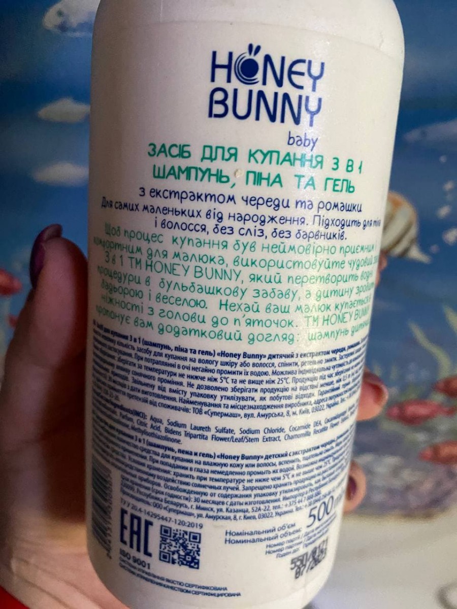Средство 3 в 1 – шампунь, гель, пена Honey Bunny – это универсальный продукт, который бережно ухаживает за кожей малыша. По рекомендации врача им можно мыть волосы, тело, а также получить пену для ванны.