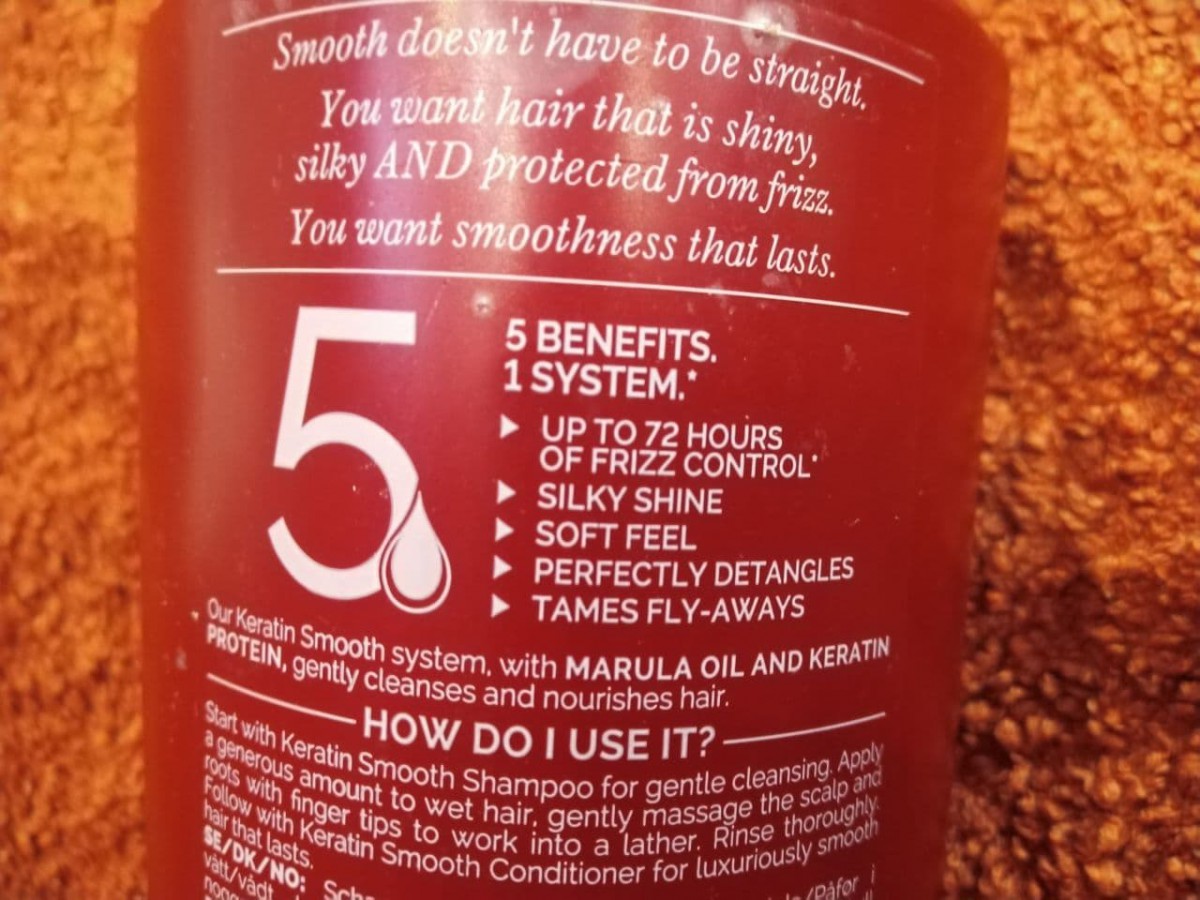 Шампунь Keratin Smooth TRESemme Pro Collection – это средство для мытья головы, имеющее в своем составе такие ингредиенты, как кератины и масло марулы. Шампунь имеет 5 главных свойств, позволяющих ему пользоваться большой популярностью среди женщин всех возрастов, с любым своим природным цветом.